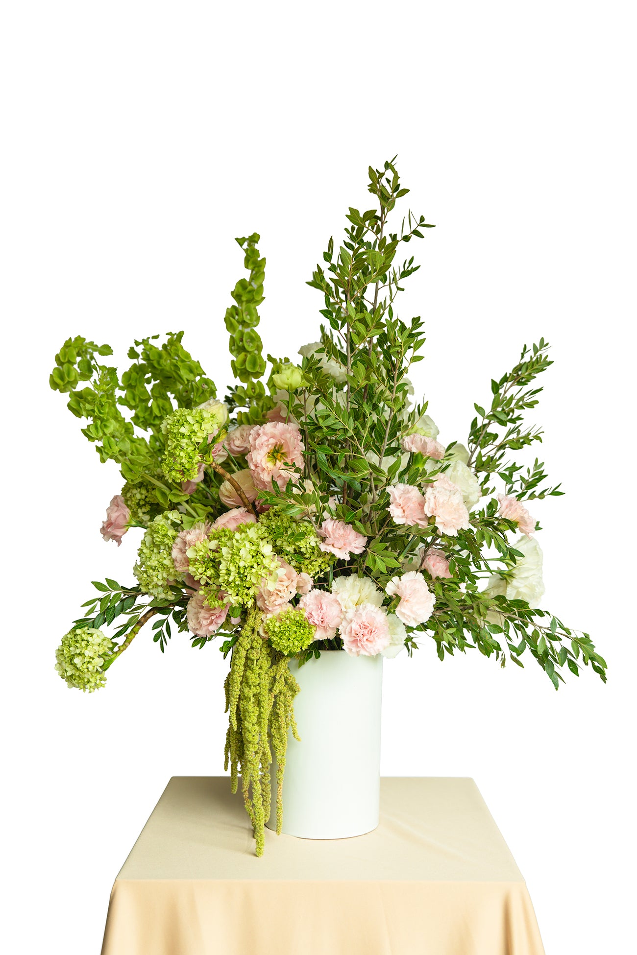 Campana, Falso Olivo, Hortensia, Lisianthus Blanco, Lisianthus Rosa, Clavel yoghurt rosa, Amaranto Verde