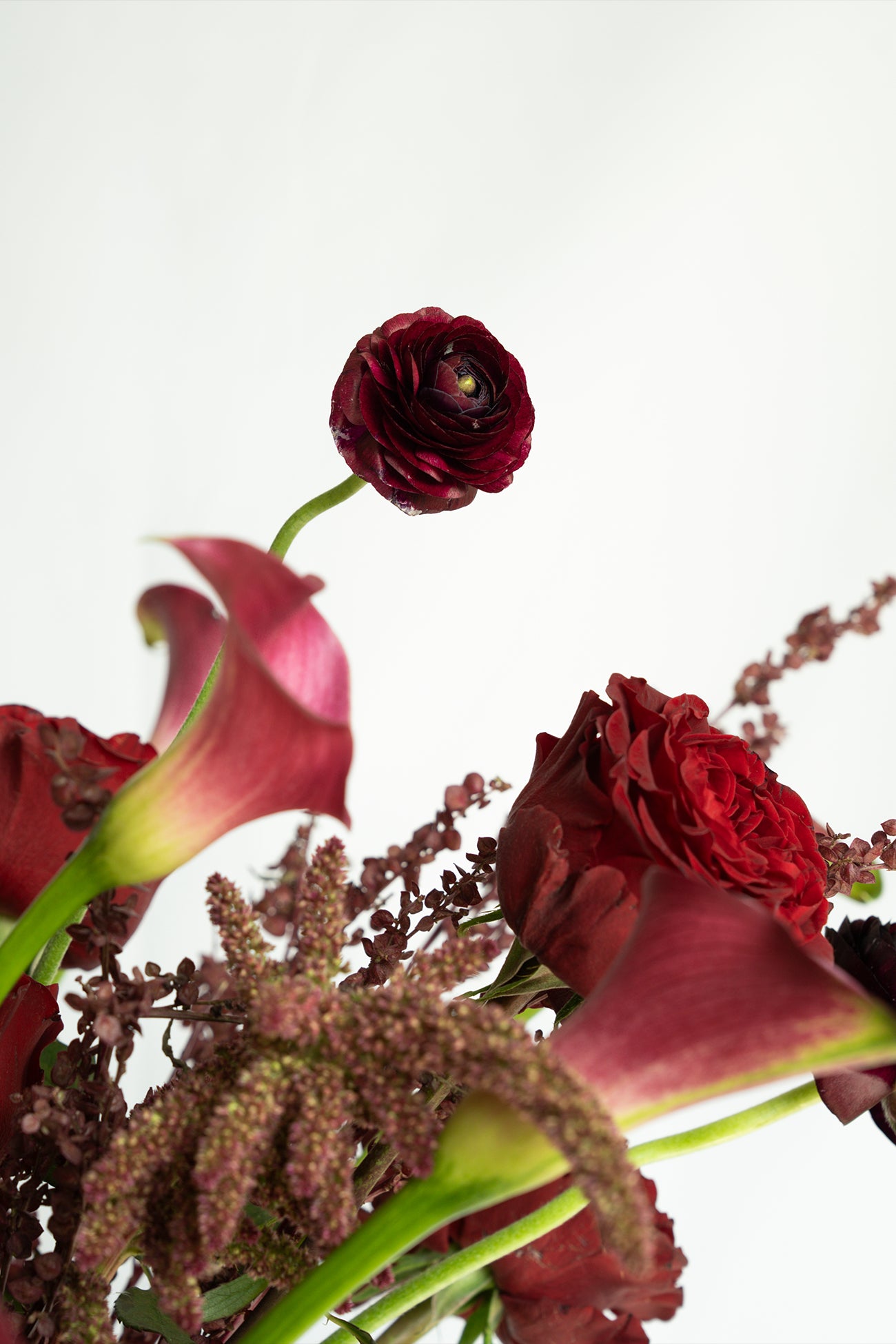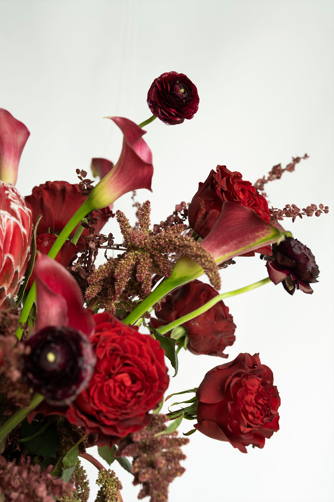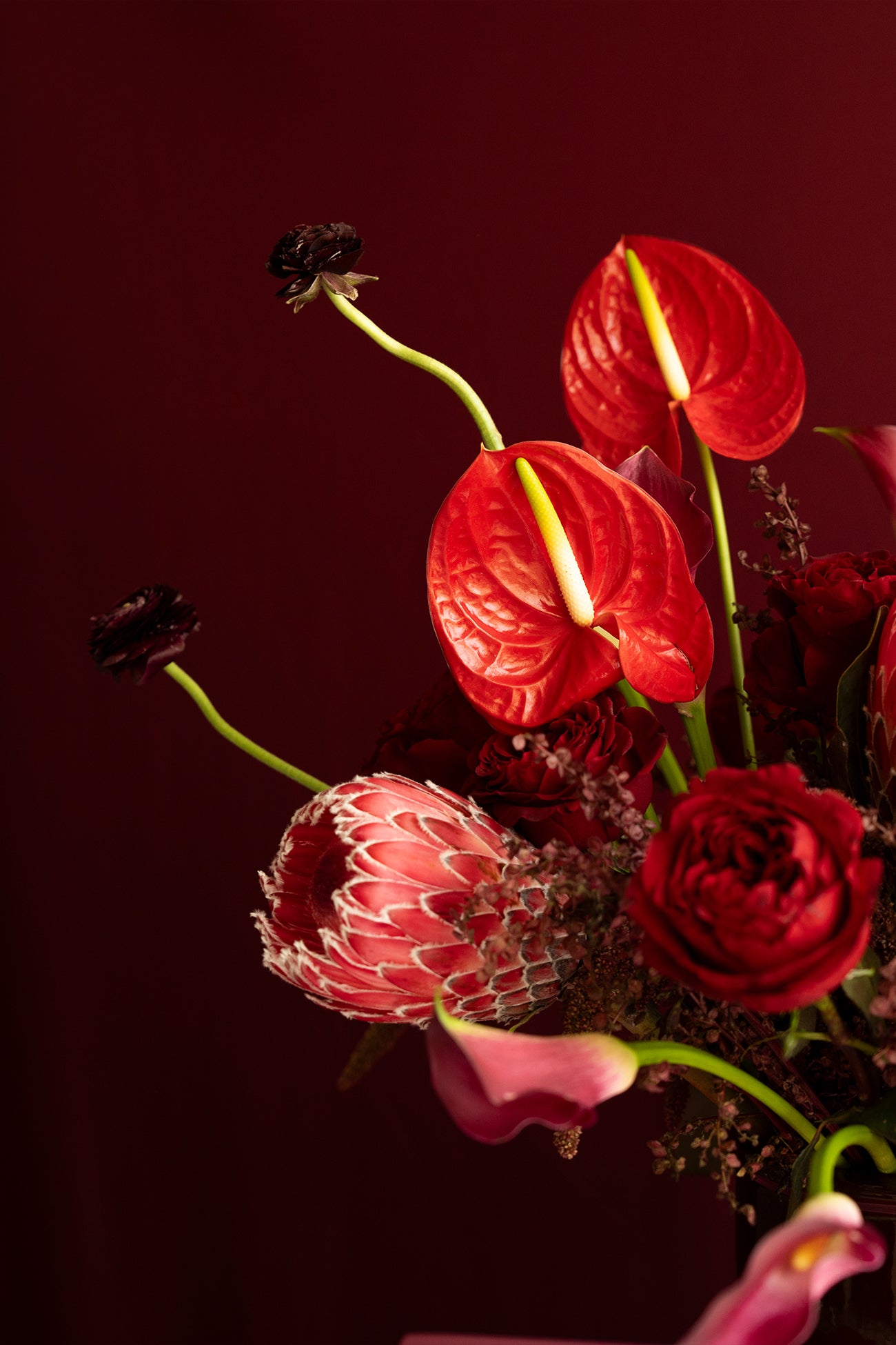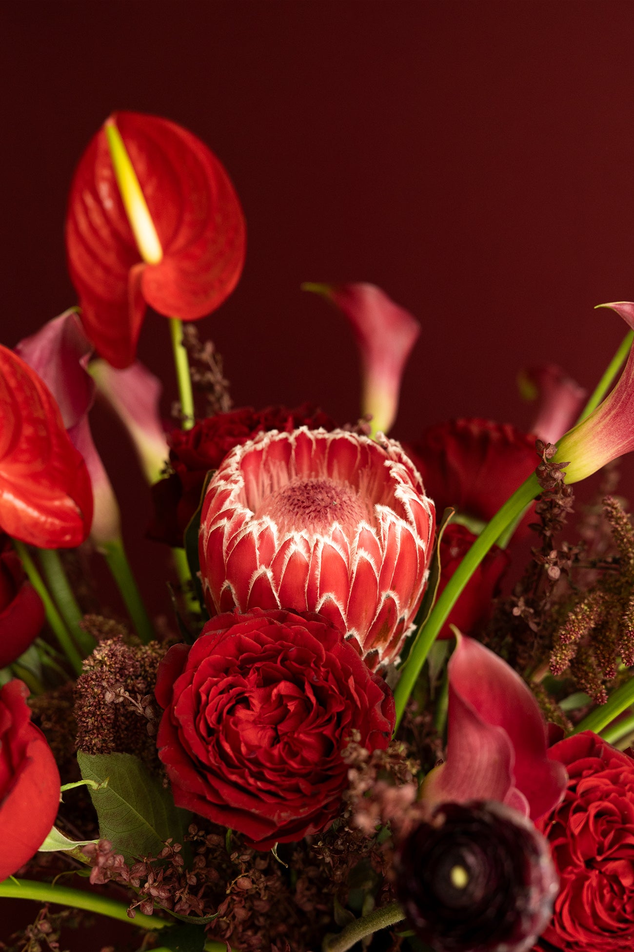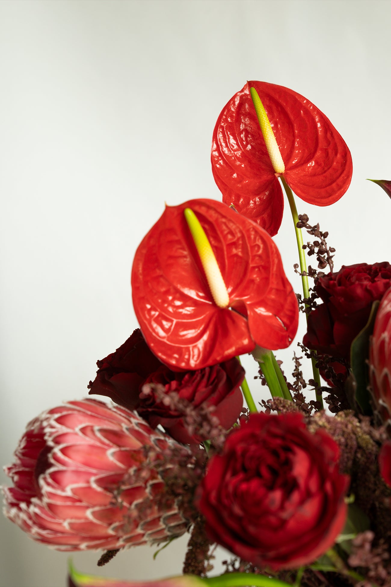 Anturios rojos, Rosa roja, Protea, Cala vino mini, Amaranto vino, Atriplex, Ranuculo vino.